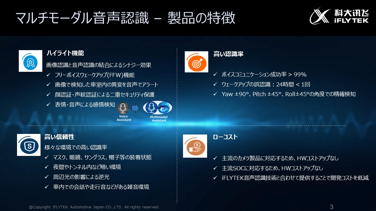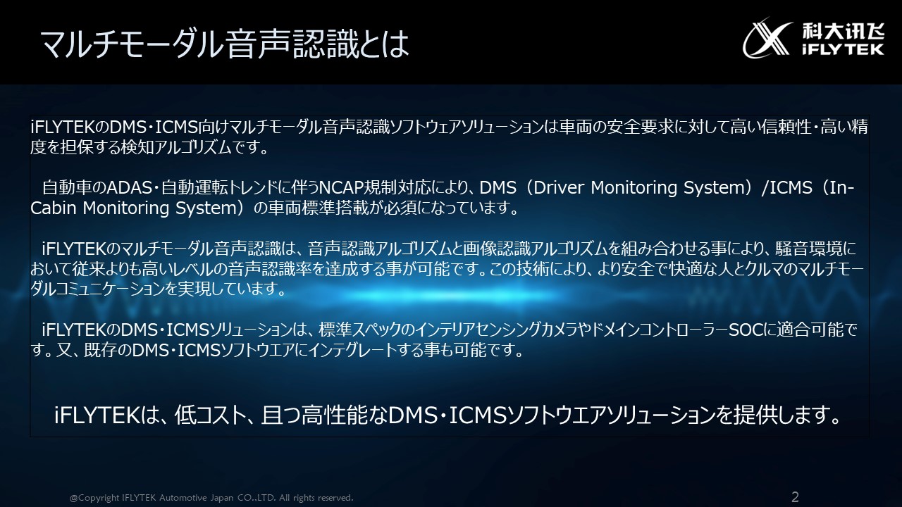 iFLYTEKのDMS・ICMS向けマルチモーダル音声認識ソフトウェアソリューションは車両の安全要求に対して高い信頼性・高い精度を担保する検知アルゴリズムです。