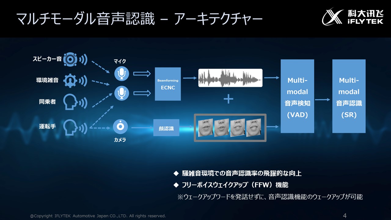 iFLYTEKのマルチモーダル音声認識は、音声認識アルゴリズムと画像認識アルゴリズムを組み合わせる事により、騒音環境における音声認識率を飛躍的に向上させる事が可能です。この技術により、より安全で快適な人とクルマのマルチモーダルコミュニケーションを実現しています。