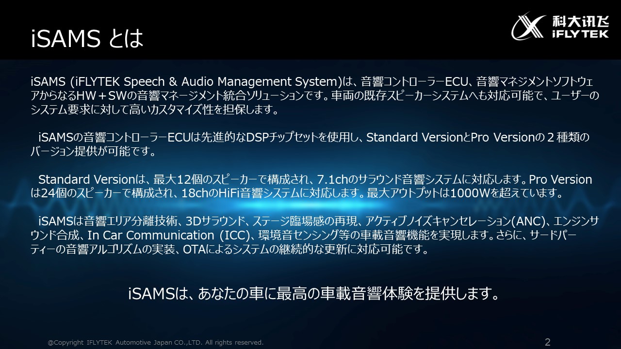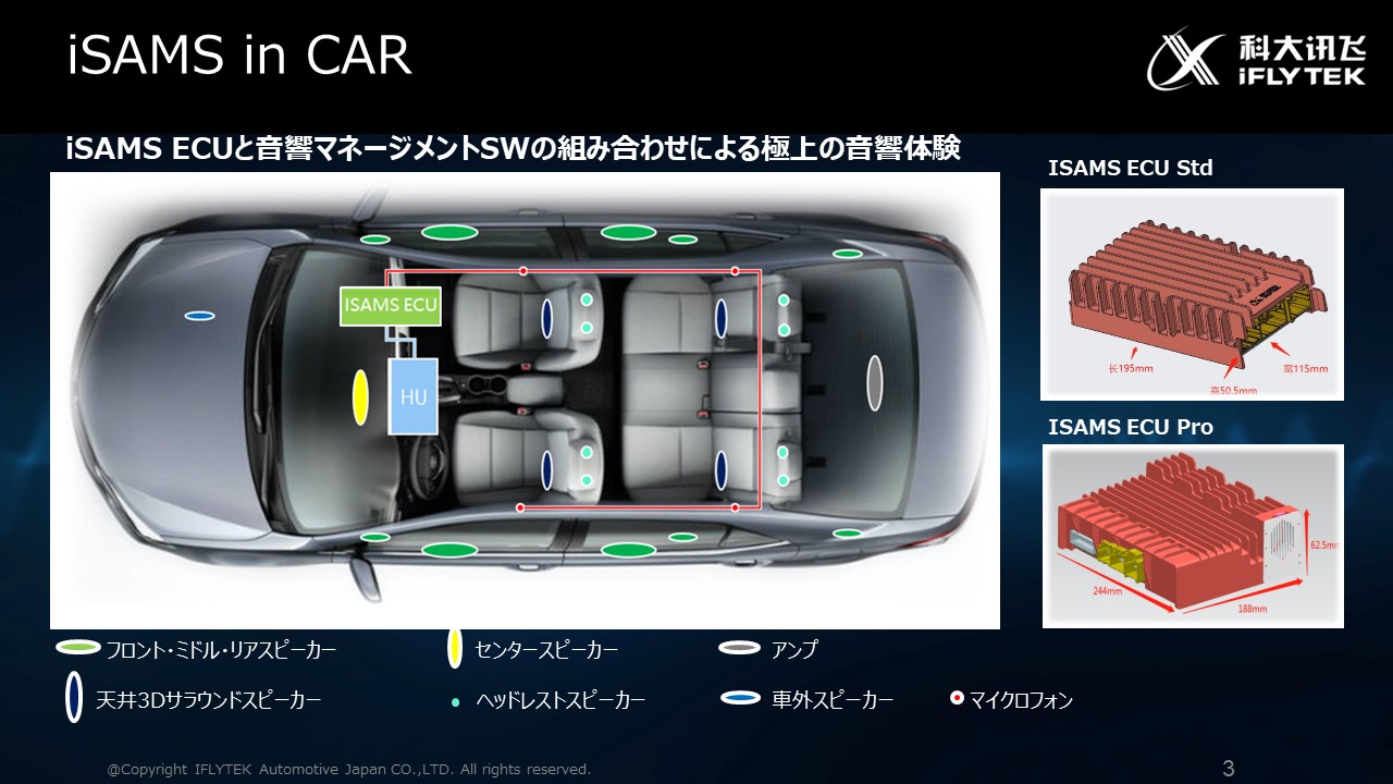 iSAMS (iFLYTEK Speech & Audio Management System)は、音響コントローラーECU、音響マネジメントソフトウェアからなるHW+SWの音響マネージメント統合ソリューションです。