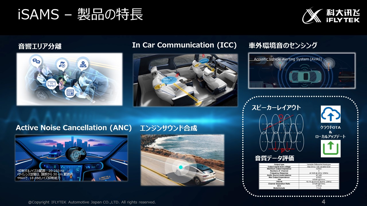 iSAMSは音響エリア分離技術、3Dサラウンド、ステージ臨場感の再現、アクティブノイズキャンセレーション(ANC)、エンジンサウンド合成、In Car Communication (ICC)、環境音センシング等の車載音響機能を実現します。 さらに、サードパーティーの音響アルゴリズムの実装、OTAによるシステムの継続的な更新に対応可能です。