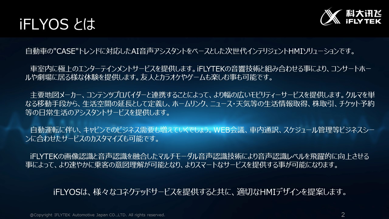 自動車の"CASE"トレンドに対応したAI音声アシスタントをベースとした次世代インテリジェントHMIソリューションです。